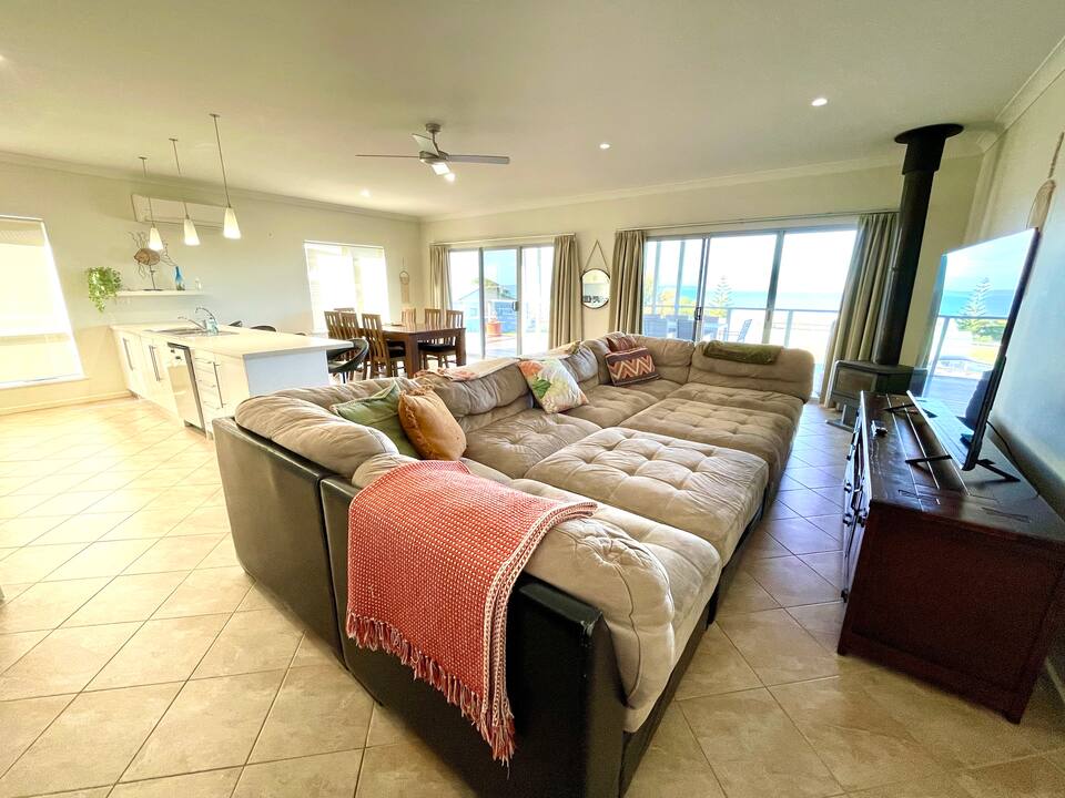 Large open plan upstairs living area and kitchen with expansive bay views.